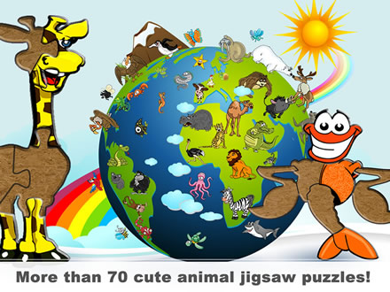 Let's go for a travel all over the world through 9 brilliant and colourful sceneries where children can have fun and solve more than 70 cute animal jigsaw puzzles.Not only an entertaining game, for each jigsaw puzzle, the name of the animal will be shown on the screen and read out loud by a native voice actor.